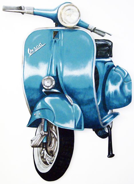 Œuvre unique vintage inspirée de la Vespa iconique 1955 premier modèle avec le phare au guidon.
